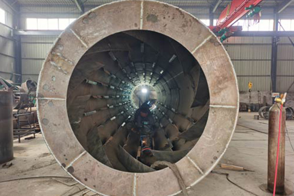 鐵屑通過傳送帶送入烘干機后,與熱源燃燒產(chǎn)生的熱空氣接觸,此時冰塊融化或者水分會逐漸蒸發(fā),由于烘干機內(nèi)設(shè)置有揚料板,會在筒體轉(zhuǎn)動的作用下不斷將鐵屑帶起,所以會加快水分蒸發(fā)的過程,使鐵屑快速干燥,干燥后的鐵屑從烘干機尾部落下由輸送帶送至倉庫中,烘干產(chǎn)生的水蒸氣則被引風(fēng)機抽出烘干機外排放,由于該機烘干過程中主要是鐵屑和水分,幾乎不產(chǎn)生其他廢氣,從節(jié)省成本方面考慮,可以不設(shè)置除塵器,除非有嚴格的要求時,再根據(jù)烘干機型號配備相應(yīng)的除塵器。